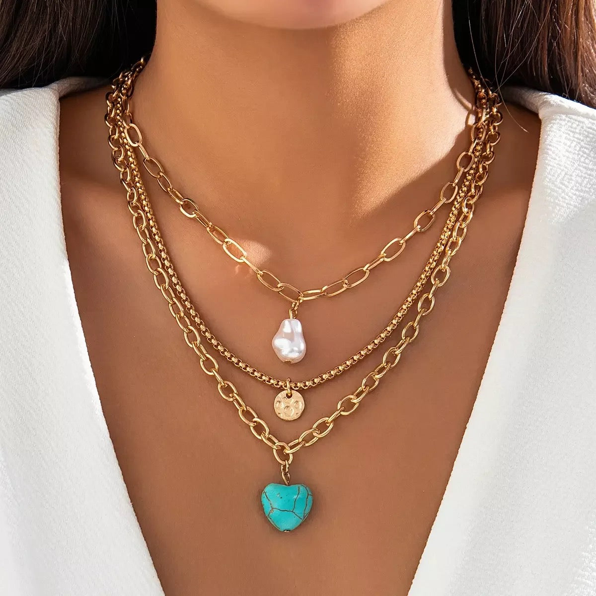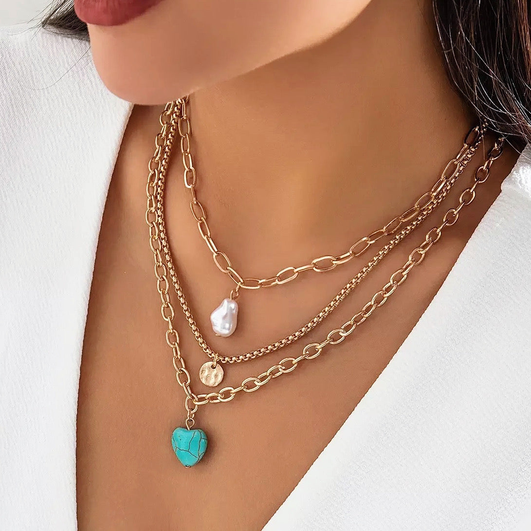 This versatile set features three separate gold-plated chains that can be worn together or separately, perfect for any occasion. The set includes a beautiful faux pearl pendant and a striking turquoise blue stone, adding a pop of color to any outfit.