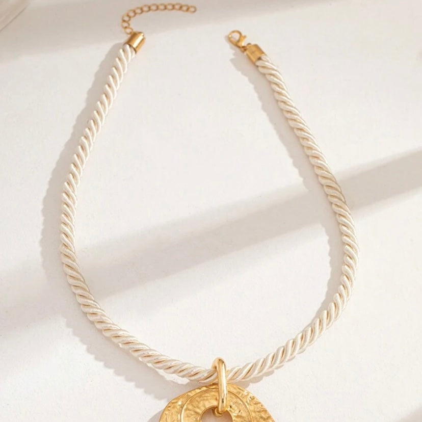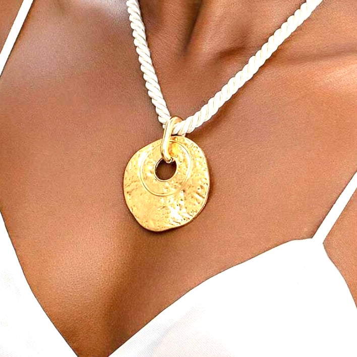 The Mykonos Necklace features a hammered golden disc pendant on a twisted rope with a golden clasp. Offering a sleek and modern design, this necklace adds a touch of glamour to your holiday outfit. The perfect accessory for summer!